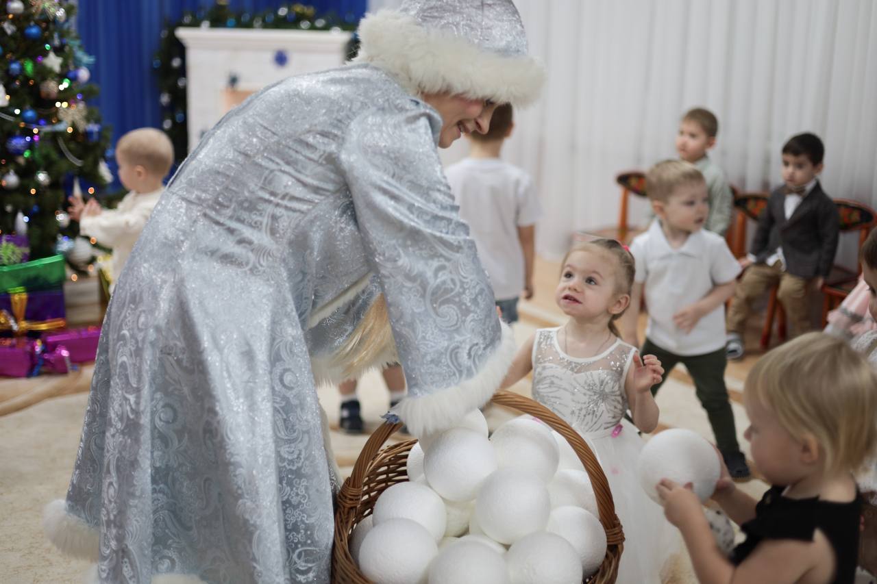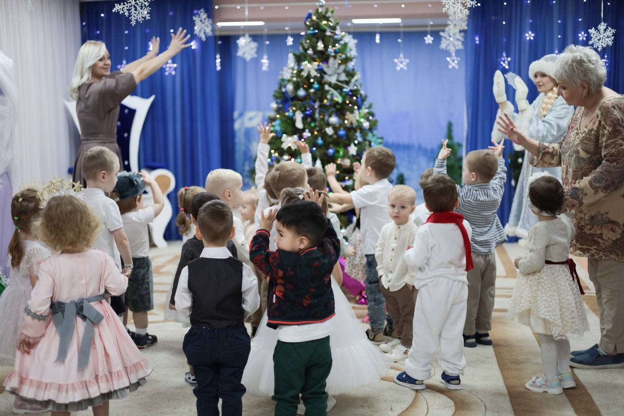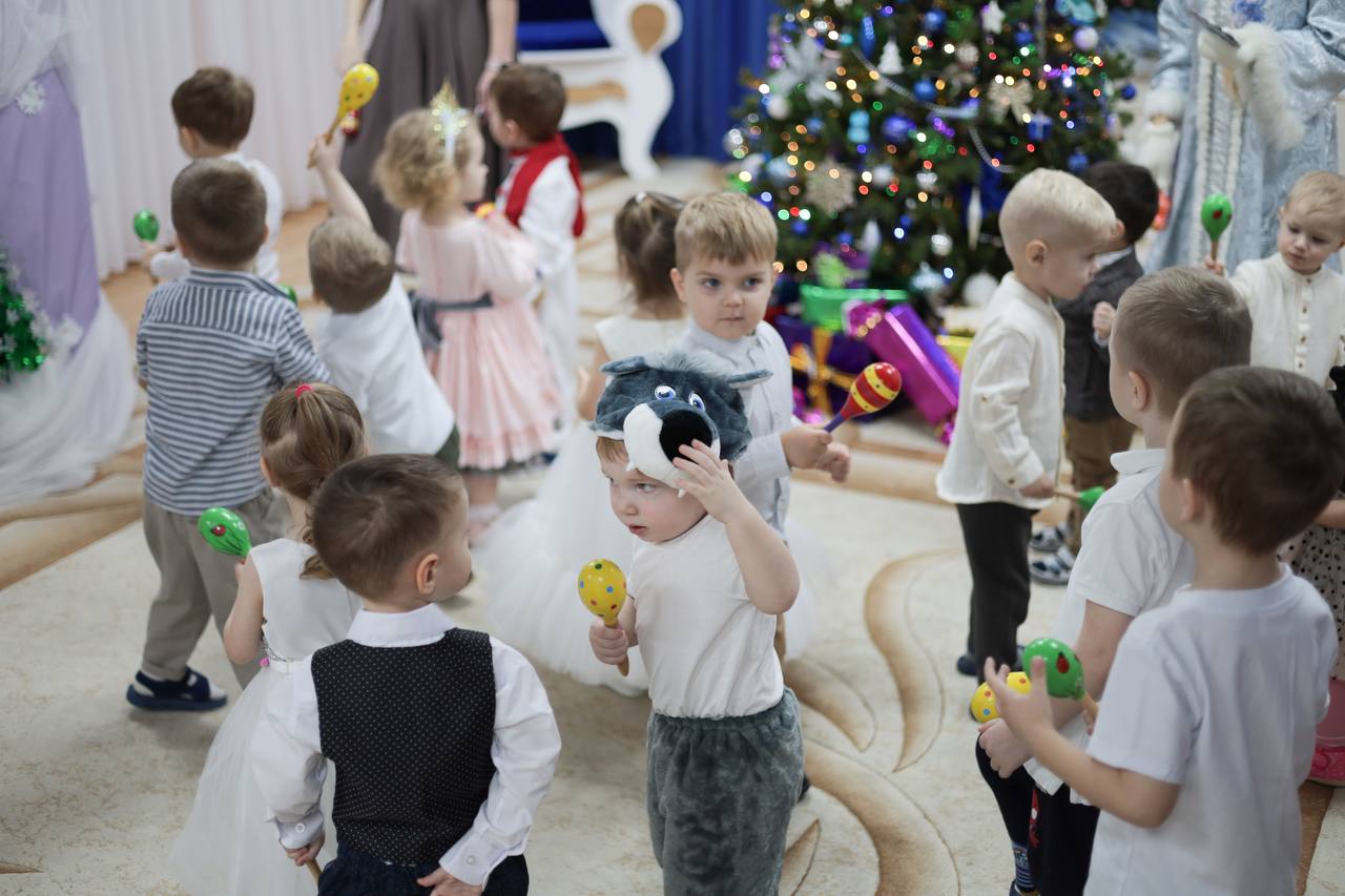 Дети в ярких костюмах принцесс и животных собирались вокруг елочки, готовясь к увлекательным играм.