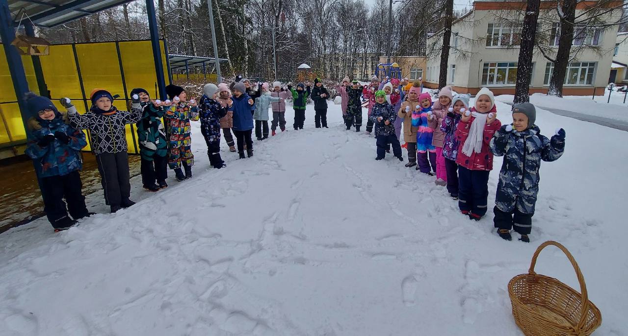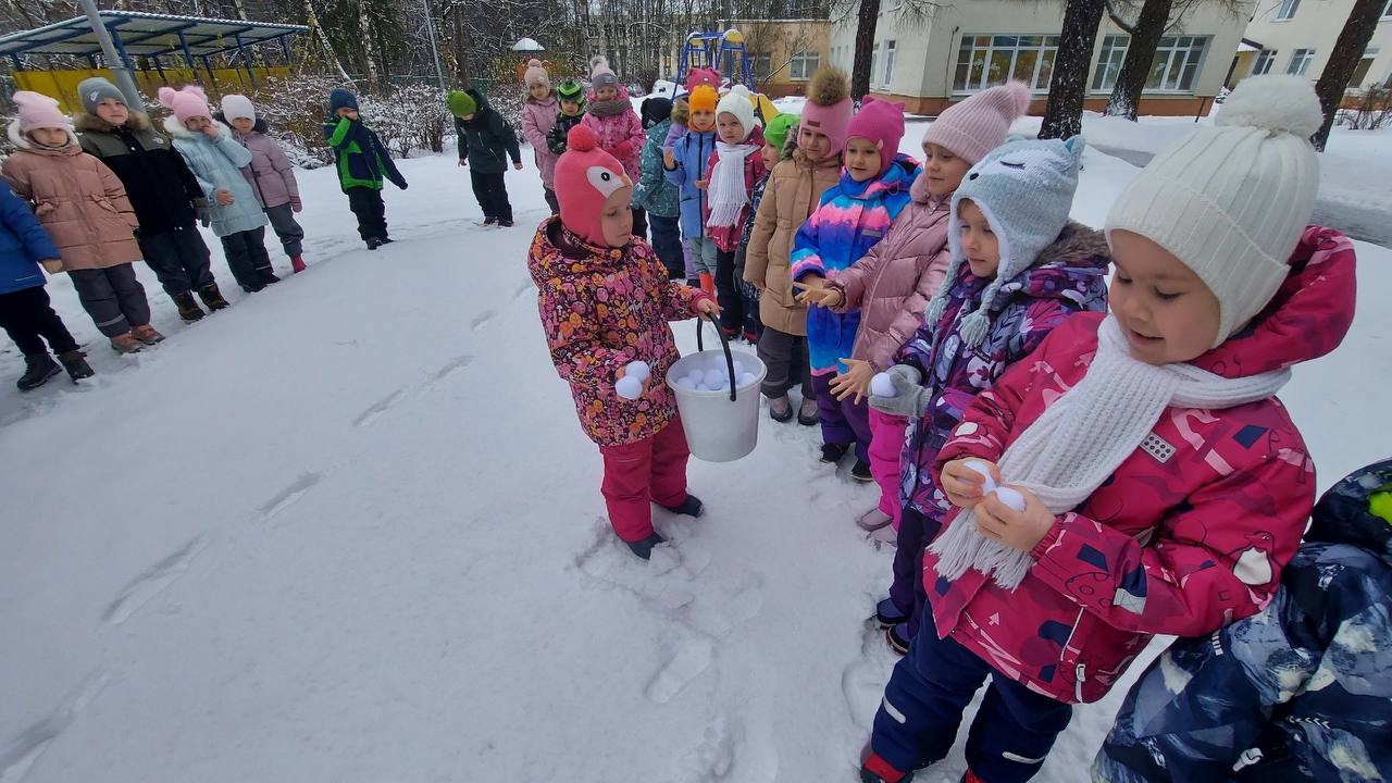Они катались с небольшой горки, лепили миниатюрных снеговиков, бросали снежки в корзину, а мальчики с помощью клюшек забивали голы в ворота.