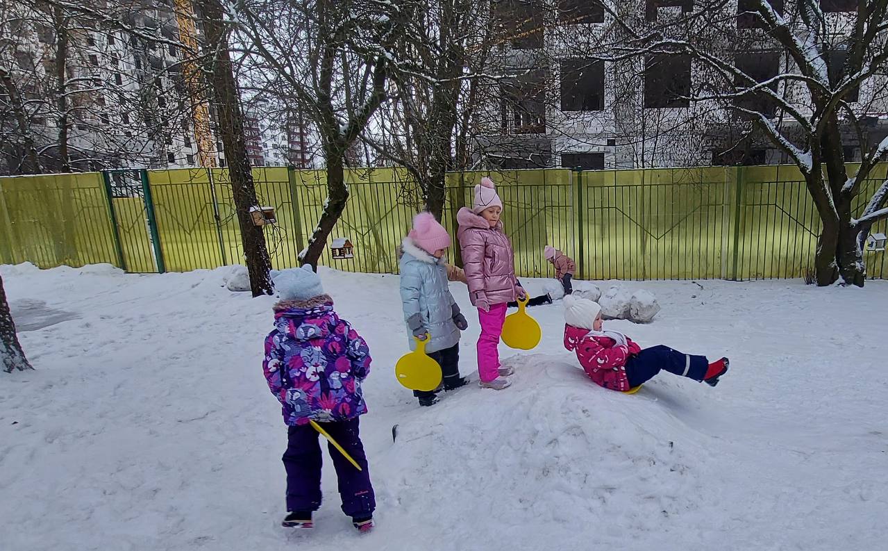Даже несмотря на малоснежную зиму, малыши сумели получить массу удовольствия, играя с тем небольшим количеством снега, что выпало.