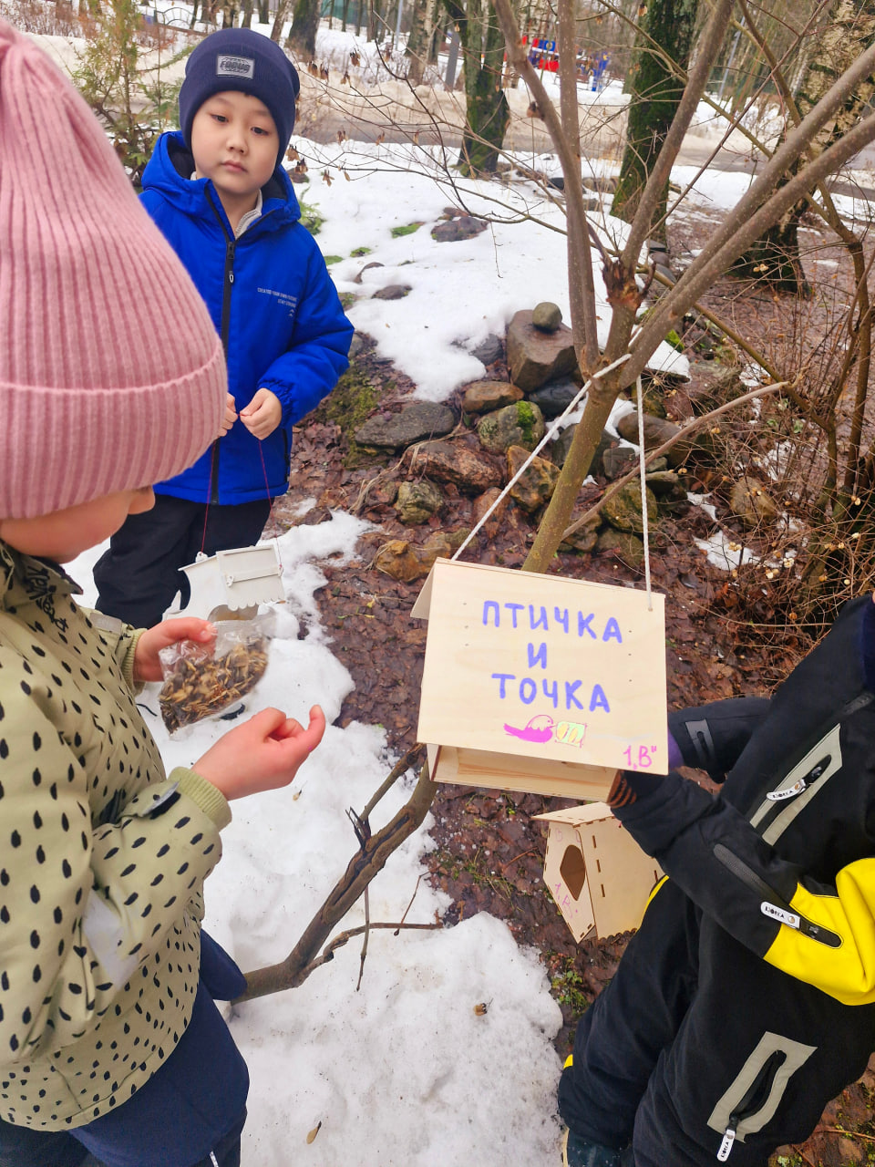 В завершение классного часа все вышли в школьный двор, где повесили кормушки.