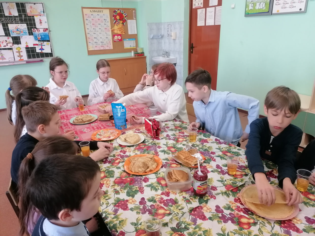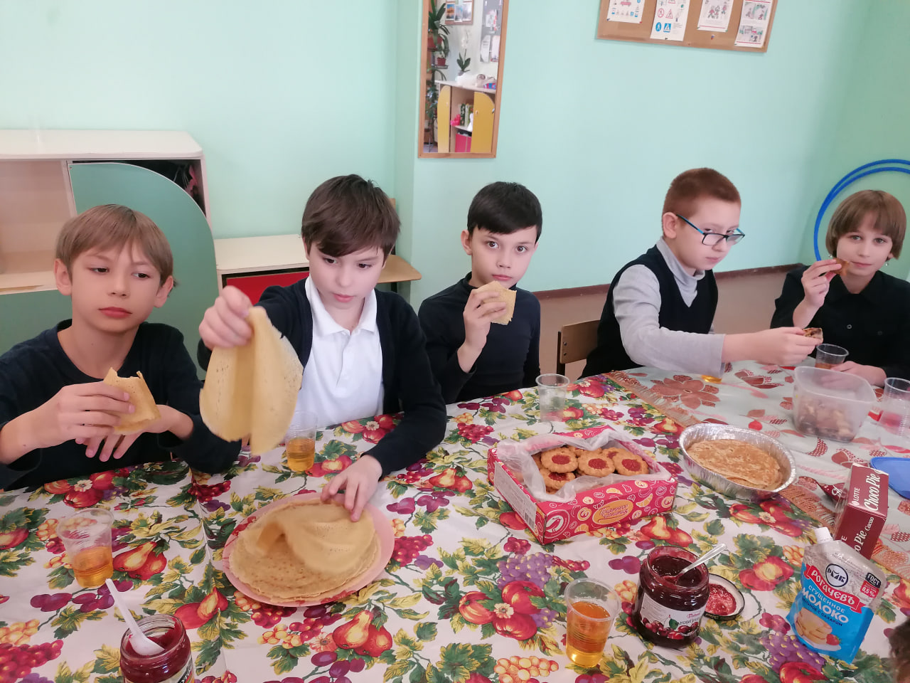 Учебная неделя завершилась играми, песнями и чаепитием с блинами, которые приготовили ребята вместе с